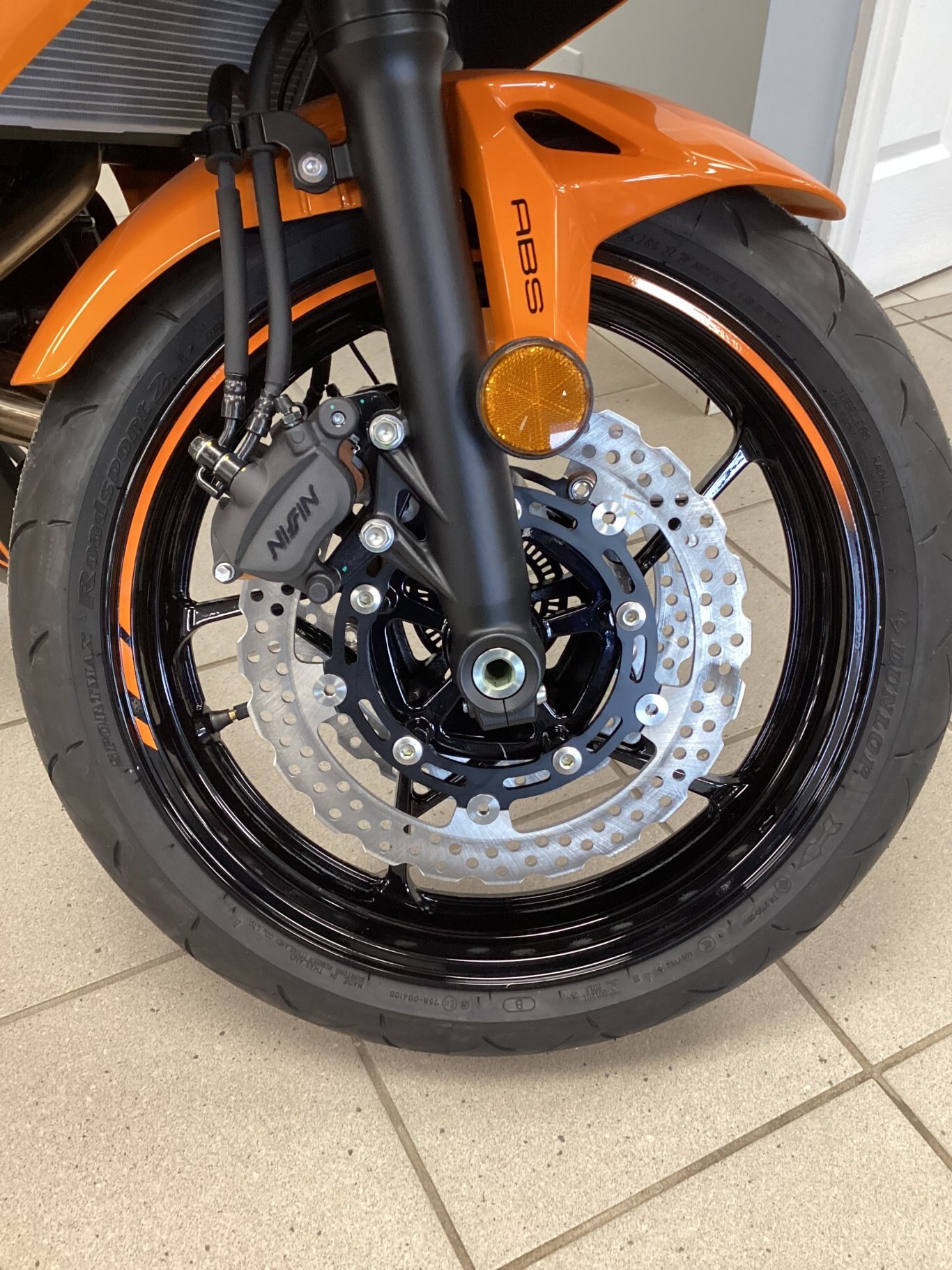 Kawasaki ABS systems use front and rear wheel sensors to constantly monitor wheel speed. Should information from either of the sensors indicate that wheel lock has occurred, the ABS ECU directs the pump in the ABS unit to modulate brake fluid pressure (releasing and reapplying pressure so that traction can be regained) until normal operation resumes. ABS offers rider reassurance that contributes to greater riding enjoyment.