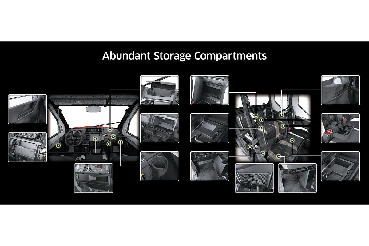 7” high-grade full-colour TFT LCD screen with speedometer, tachometer, fuel gauge, gear indicator (L, H, N, R), Driving Mode (2WD/4WD/4WD+Diff Lock), Power Mode (Work/Normal/Sport), clock, CVT temperature; selectable display that includes: digital tachometer, odometer, dual trip meters, total time, trip time, average speed, water temperature, battery voltage; Bluetooth indicator, Economical Riding Indicator, maintenance reminder (2 driver-selectable reminders), and a range of indicators and warning lamps