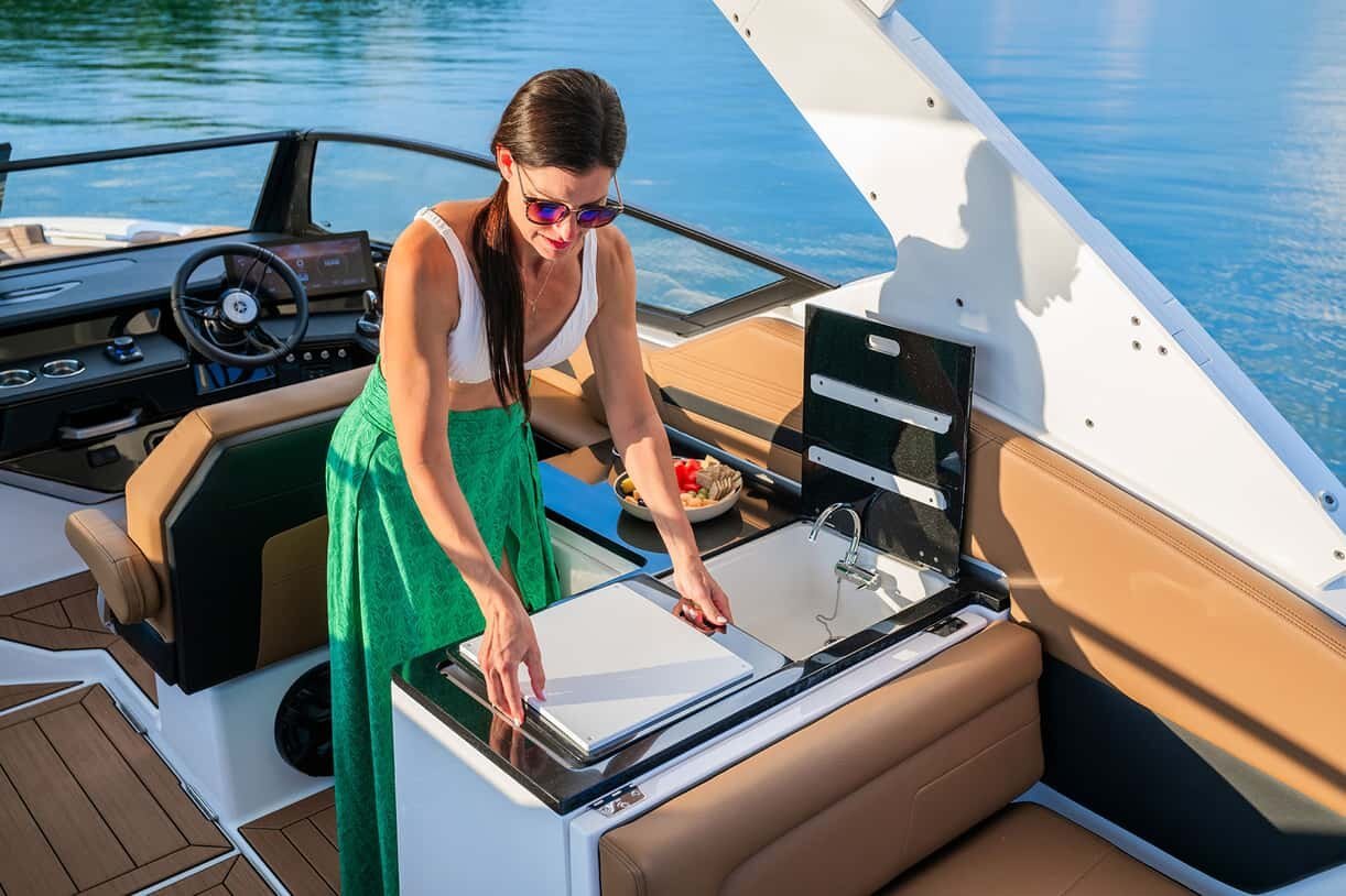 The stern of the 29SE boasts the largest seating area available in a Yamaha boat, offering ample space for relaxation and socializing. The versatile seating can also be customized to perfectly suit each boater's unique preferences and needs.